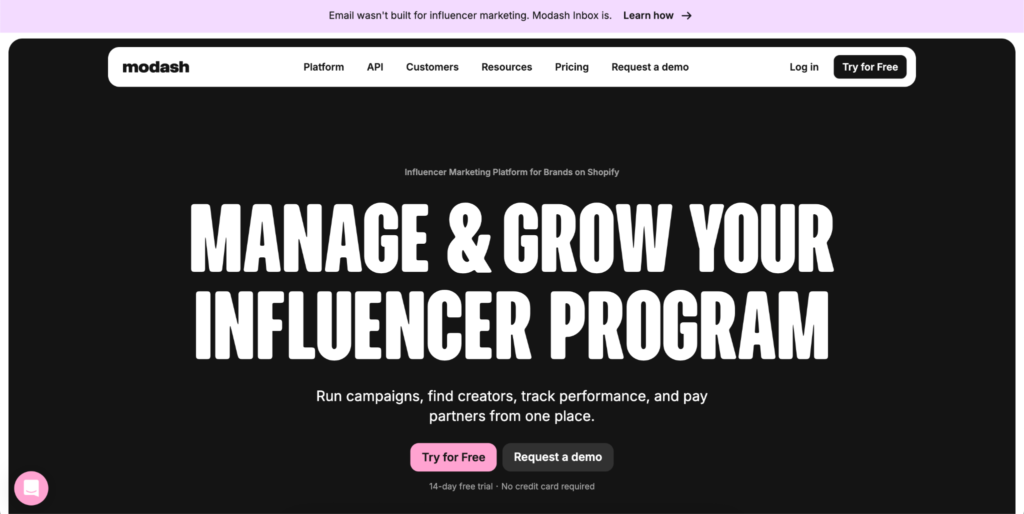 Modash indexes 350M+ public creator profiles and pairs that massive database with AI visual discovery – upload an image or describe a style and the platform finds matching creators. Its Shopify-native affiliate workflows make it particularly strong for eCommerce brands expanding their creator reach across platforms.