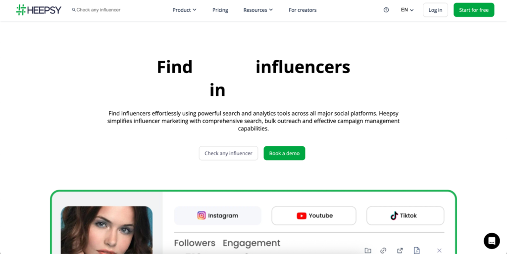 Heepsy provides an accessible starting point for multi-platform discovery. Its 50M+ database covers US and European markets across key social networks, and the free plan lets brands explore multi-platform search before committing any budget.